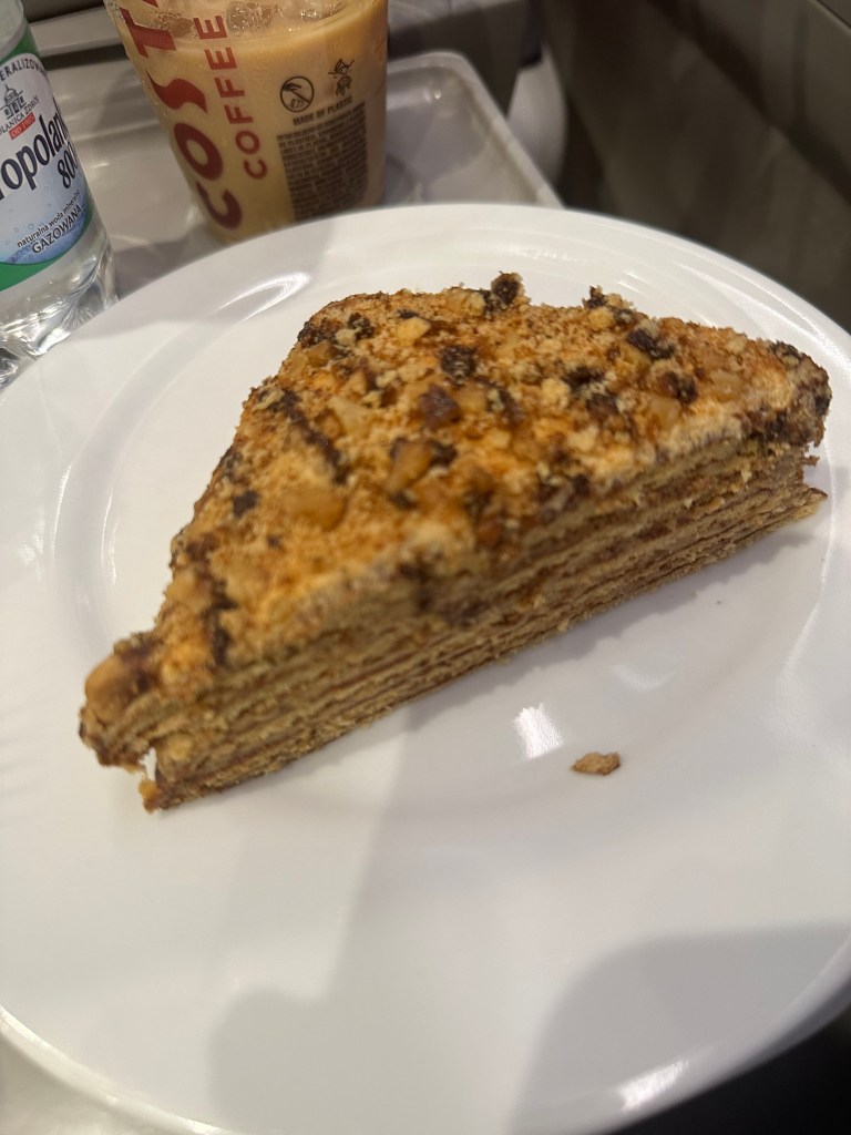 Now, I dont know if anyone caught that I booked a flight to Warsaw but the blog post is about Krakow. I flew into Warsaw because it was about $150 cheaper. I then took a 30 min train into the center of Warsaw and from there took a 3 hour train ride from Warsaw to Krakow. Now I know time is money and I should have just paid for the flight to Krakow, however I wanted to visit somewhere else and the flights back into Krakow from multiple places were not worth it. Since I was alone, I was able to make this decision for myself, however if you were are traveling with others, you may have chosen other options. I did not want to feel rush or worry about missing my connecting flight so I didn’t buy train tickets until I got into Warsaw. The airport was very easy to navigate, they had painted lines to direct where you were going and signs in English and Polish. The train I rode, I bought a first class ticket because on vacation, the limit does not exist. This included a nice seat, a drink and a snack. The honey cake I had was very good, I wish I had another one to eat later.